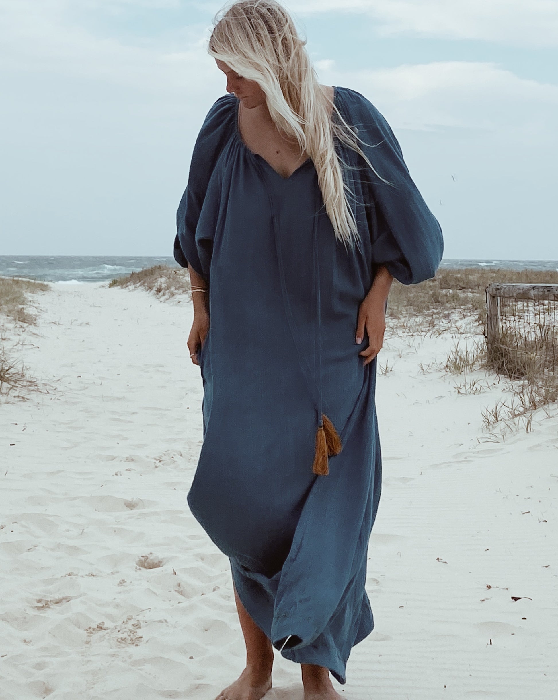The Stromboli Kaftan has a oversized puff sleeve with elastic at the wrist and can be worn sleeves up or down. Gathered at the neck it can be worn open or tied, its comes with a signature criss cross embroidery at the hem, neckline and tan tassel. It also comes with a matching waist tie